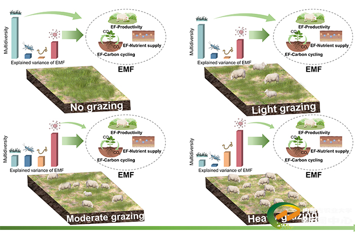 该研究基于短花针茅荒漠草原长期放牧试验平台,系统分析了不同放牧强度下地上和地下生物多样性对生态系统多功能性的差异性影响。研究表明,轻度放牧显著增加了生态系统多功能性,尤其是地上生态系统多功能性。随着放牧强度增加,生态系统多功能性的驱动因素由地上生物多样性转向地下生物多样性,生物多样性的协同效应与互补效应在放牧条件下共同维持生态系统多功能性。