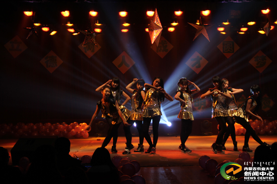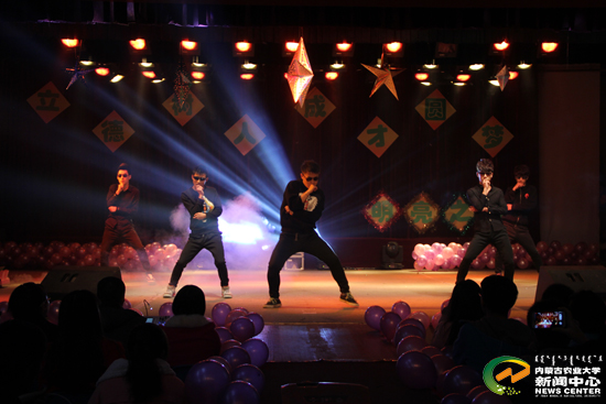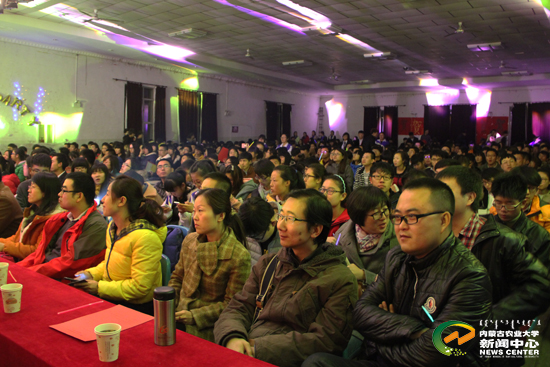 早早来到礼堂的同学把现场布置得温馨而美丽,学院四百名师生欢聚一堂,共同迎接晚会开始。晚会现场,多才多艺的同学们为大家带来了视觉与听觉的盛宴。俊朗的蒙古族小伙和美丽的蒙古族姑娘用优美的歌声把大家带到了大草原;两位帅气的研究生表演的歌曲《奔跑》,鼓舞了在场的每一个人;更有诙谐幽默的小品表演《网吧趣事》和《如此队友》,逗得观众合不拢嘴。