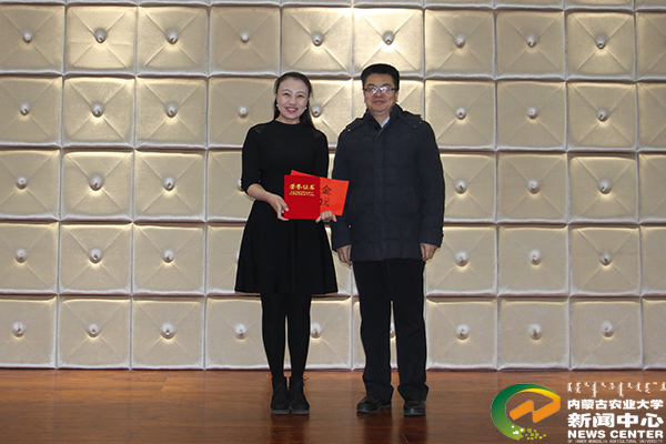 校党委副书记侯晨曦(右)为获得一等奖的贺斐老师(左)颁奖