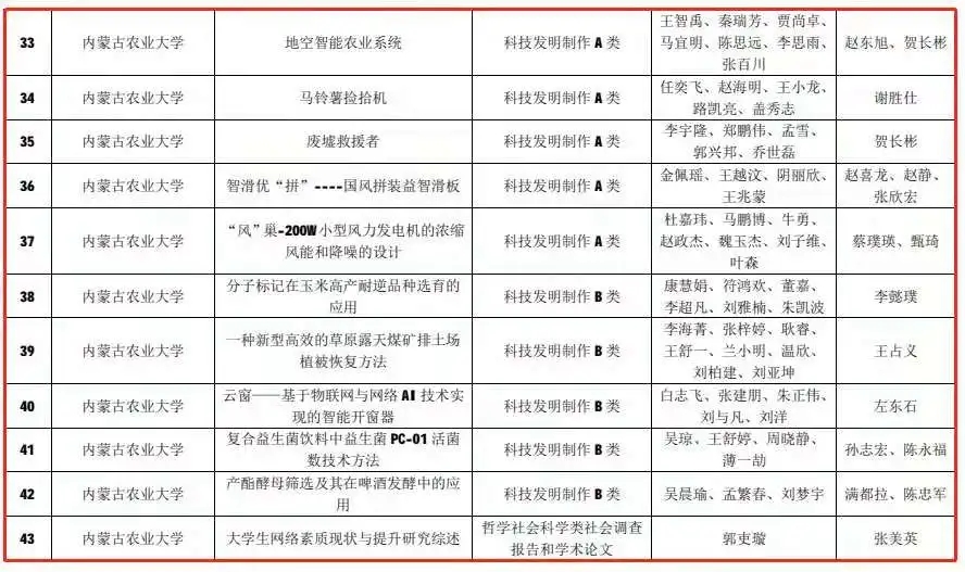 学校选拔上报的40件作品,共有38件作品获奖。其中,《草原肉羊天气指数保险政策实施现状、问题与对策——基于内蒙古自治区锡林郭勒盟实地调研数据》等2件作品获得特等奖,《胡麻种质遗传多样性分析》等5件作品获得一等奖,《环糊精——百里香精油包合物对马铃薯采后腐烂的抑制作用》等9件作品获得二等奖,《山羊全基因组转录因子的预测及动态网络的分析》等22件作品获得三等奖。
