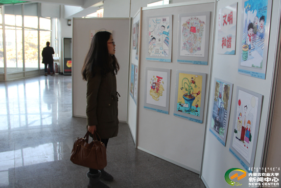 点线间描绘文明和谐与自由平等的独白,色彩中交织着对中国梦的吟颂。一幅幅生动形象的作品,带领大家共同走进艺术的世界去感受生活的丰富多彩。师生们借助手中的笔,以漫画、插画的形式诠释了社会主义核心价值观,使更多的师生加深了对社会主义核心价值观的理解。