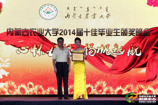 6月16日晚,我校2014届十佳毕业生颁奖晚会在东区田径场举行。自治区团委学校部副部长齐斯琴,我校校友、内蒙古和信园蒙草抗旱绿化股份有限公司董事长王召明应邀出席。校党委书记邬建刚,副书记郑俊宝、侯晨曦,副校长芒来出席晚会。各职能处室和各学院领导、师生代表观看了晚会。