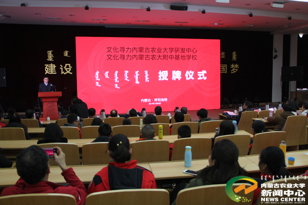 仪式现场播放了“文化寻力项目介绍宣传片”“蒙古族工艺美术研究所宣传片”“内蒙古农业大学附属中学宣传片”。同时,李松主任和王学文副总裁分别为文化寻力内蒙古农业大学研发中心和文化寻力内蒙古农大附中基地学校授牌,标志着内蒙古自治区第一所文化寻力研发中心和基地学校正式挂牌成立。