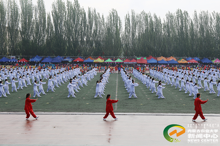 绿茵操场上,白色的太极服形成一个方格,其间闪耀着点点粉黄,庄重又不失活泼。500余名学生衣袂飞扬,潇洒飘逸,在柔美的音乐中,或沉稳缓慢,或拳拳生风,或飘逸灵动,整个太极表演整齐划一、动作一气呵成,展现了刚柔并济之美、和谐有力之姿。400名青春活力的姑娘,挥舞红色旗帜,展现旌旗猎猎之风、青春亮丽之采,手举五色花球,跃动间组成黄蓝相间的本次运动会届次“53”,献礼运动员、献礼开幕式。