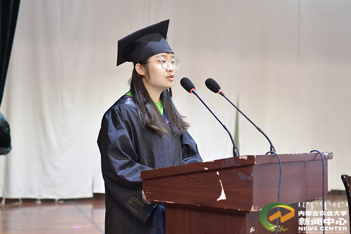 毕业生代表、沙漠治理学院硕士毕业生张超和动物科学学院本科毕业生崔志洁在典礼上发言。他们代表全体毕业生表达了对母校、老师、同窗的感激和不舍,表示他们虽会有不同的选择,不同的人生经历,不同的社会角色与担当,但始终印有相同的二维码标识——内蒙古农业大学。他们都将带着母校的教诲与荣耀再次出发,踏上新的人生征程,用奋斗的行动和感恩的情怀书写无愧于新时代、无愧于内农人的华彩篇章。