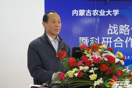 芒来代表学校致辞,他指出,学校近年来围绕自治区马铃薯产业发展需求,专门成立了“马铃薯高产高效理论与技术创新团队”,先后承担公益性行业专项、国家科技支撑项目、国家自然科学基金等20余项科研项目,在马铃薯新品种选育、脱毒种薯繁育、高产优质种植技术集成、贮藏关键技术等方面取得了一批科研成果,马铃薯生产实用技术推广应用力度不断加大,取得了良好的经济效益和社会效益。加强校企合作、推进协同创新,是学校开放办学战略的重要内容。我校与民丰薯业进行合作,依托学校的人才和科研优势,一定会将马铃薯产业做大做强。希望双方以此次签约为契机,实现优势互补、互惠共赢,不断扩大合作范围,深入拓展合作领域,着力提高合作层次,为推进乌兰察布市经济社会发展、带动农牧民增收致富做出更大的贡献!