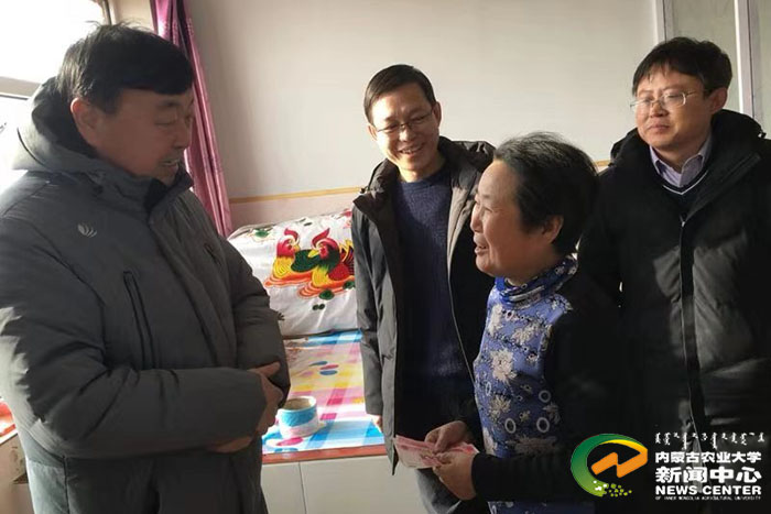 为进一步贯彻落实习近平总书记精准扶贫战略思想,坚决打赢脱贫攻坚战,在2020年春节即将来临之际,内蒙古农业大学副校长乔彪率党委组织部、宣传部和工会等相关部门负责人冒零下30度的严寒于1月14日赴我校定点帮扶村四子王旗吉生太镇公合成行政村对坚守驻村工作一线的老师们和村民进行了走访慰问,为村民送上校党委和全体师生的新春关爱与祝福。