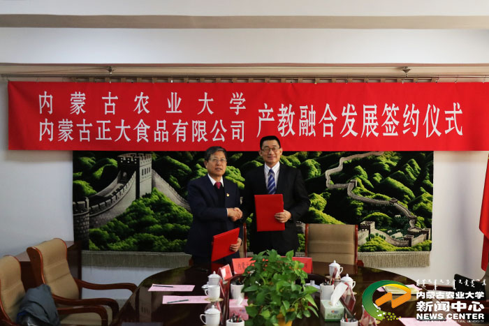 内蒙古正大食品有限公司为世界500强企业正大集团在内蒙古区独资全产业链现代化农牧领袖企业,致力于农牧业产业化经营,集种植、饲料生产、养殖、食品加工、销售于一体的现代农牧龙头企业。多年来,双方在教学科研等方面开展了卓有成效的合作,2013年双方合作获批“内蒙古农业大学-内蒙古正大有限公司农科教合作人才培养基地”。随着国家脱贫攻坚、乡村振兴、生态文明和美丽中国建设战略的实施以及农牧业4.0发展建设需求,结合教育部新农科建设、卓越农林人才教育培养计划2.0要求,为适应新时代产教融合战略升级需要,双方签订“产教融合人才培养战略合作协议”,合作的广度、深度进一步拓展。