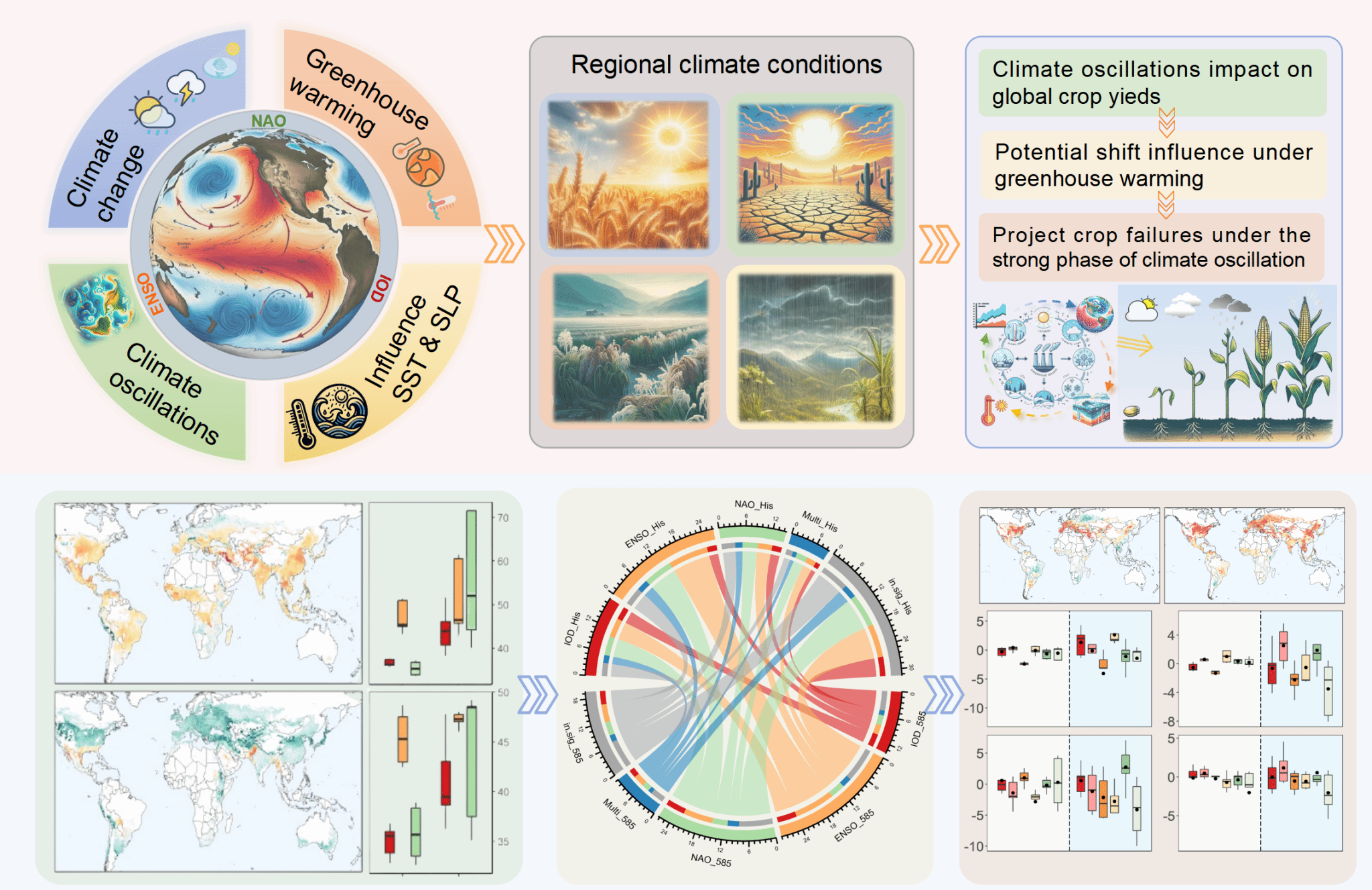 在全球气候变暖背景下,极端气候事件日益频繁,多个主要产粮区遭受减产的风险显著上升。本研究聚焦于气候振荡(包括厄尔尼诺-南方涛动 ENSO、北大西洋振荡 NAO 和印度洋偶极子 IOD)如何在变暖背景下重新塑造全球作物产量格局以及加剧粮食生产系统的脆弱性。通过结合人工智能算法与多模式耦合的全球作物-气候模拟体系(包括12个全球作物模型与5个CMIP6气候模式),系统评估了从1901年到2099年气候振荡对全球四大粮食作物(玉米、小麦、水稻和大豆)产量变异的影响,并揭示了这一影响随温室气体排放路径和气候情景的动态演变特征(图1)。