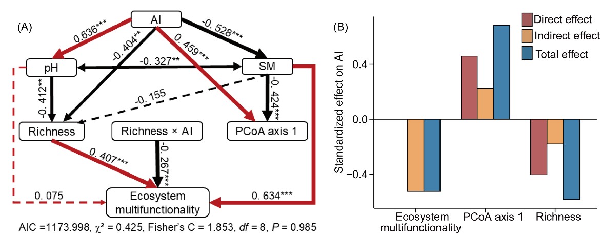 图2 干燥度指数(AI)通过直接和间接途径(包括pH值、土壤水分、丰富度、丰富度×AI以及群落组成)对生态系统多功能性的影响
