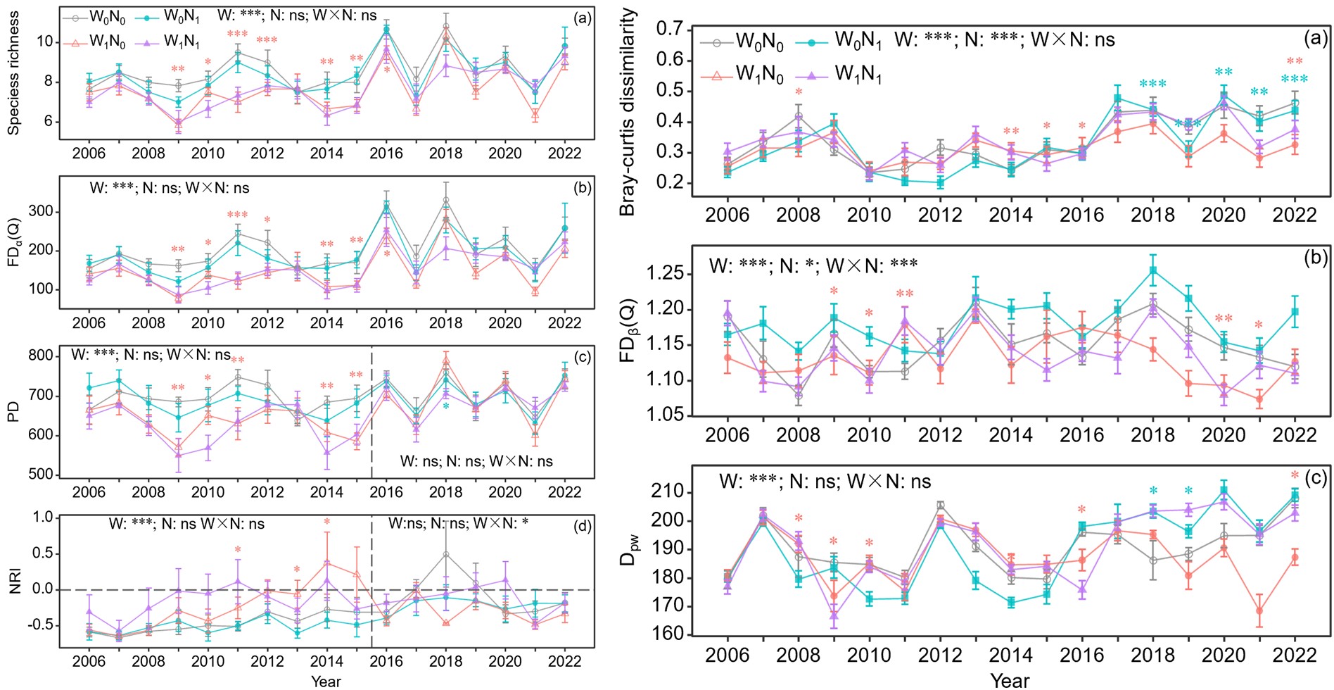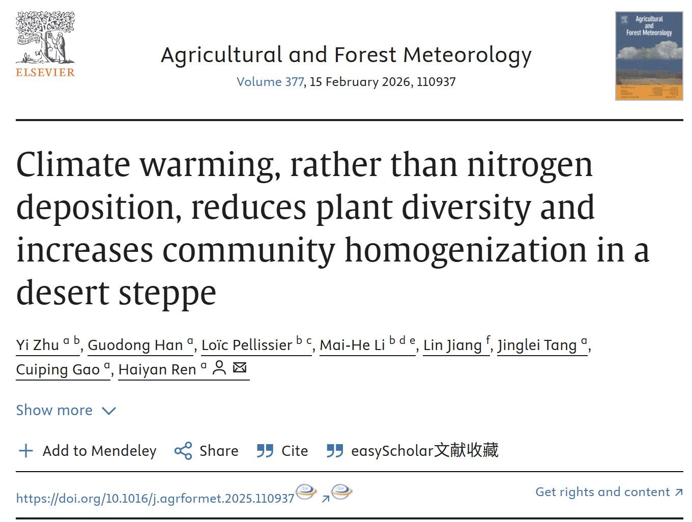 在《Agricultural and Forest Meteorology》发表的研究,题为“Climate warming, rather than nitrogen deposition, reduces plant diversity and increases community homogenization in a desert steppe”,基于连续17年的全球变化野外控制实验,系统评估了增温和氮沉降对荒漠草原植物在分类、功能和系统发育三个维度的α与β多样性影响。研究表明,增温显著降低植物分类和功能α多样性;系统发育α多样性下降主要集中在实验前10年,并在2015年极端干旱引发的群落结构重置后趋于稳定。增温在三个维度均导致β多样性下降,显著加剧群落同质化;相比之下,氮添加仅提升分类与功能β多样性,对系统发育维度无显著作用。物种周转分析揭示:偶见种(初始密度和覆盖度较低)在增温情景下更易丧失,而叶氮含量高、光合能力强的物种更易定植;增温导致的物种丧失主要集中在与常见种亲缘关系较远的类群,使群落系统发育结构由“分散分布”逐步向“随机分布”转变。