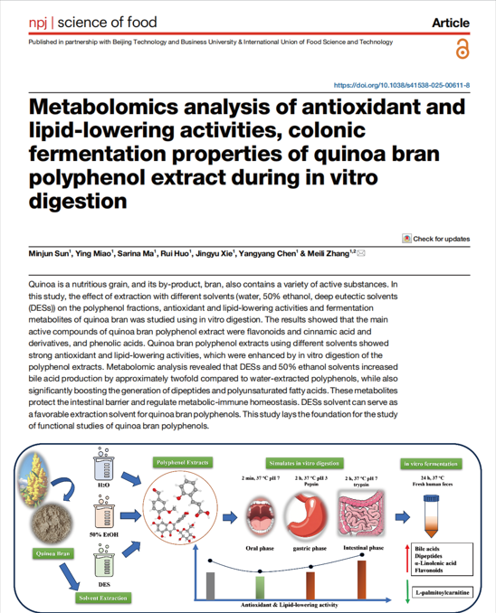 我校食品院张美莉教授课题组在Nature旗下期刊NPJ Sci Food发表新成果:揭示藜麦麸皮多酚消化发酵特性,抗氧化降脂机制获代谢组学解析