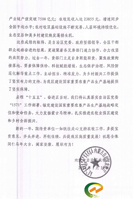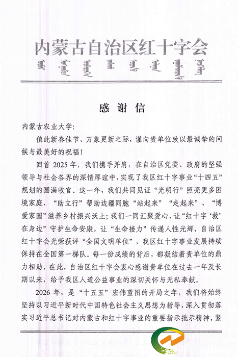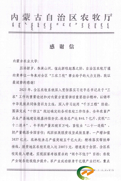 自治区农牧厅在感谢信中指出,2025年全区农牧业高质量发展成效显著,圆满完成“十四五”农牧工作各项目标任务。感谢内蒙古农业大学的鼎力支持与深度参与,学校立足自身职能职责,聚焦政策衔接落地,充分发挥学科特色与人才资源优势,在科技赋能、要素保障、生态治理等重点工作主动作为、精准发力,为自治区建设国家重要农畜产品生产基地提供了坚实有力的支撑。
