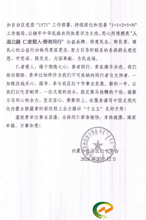 自治区红十字会在信中对我校长期关心支持人道公益事业表示衷心感谢,高度评价学校在凝聚社会爱心、服务基层群众、铸牢中华民族共同体意识等方面发挥的重要作用。过去一年,双方携手推进“光明行”“助立行”“博爱家园”等特色品牌项目,共同守护人民群众生命安康、助力乡村振兴全面推进,推动全区红十字事业稳居全国第一梯队。